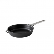 Vankka, Ruotsissa valmistettu paistinpannu/piirakkavuoka ruotsalaisesta hiiliteräksestä. Tässä mallissa on irrotettava kahva, jonka voi kiinnittää ja irrottaa helposti peukalopainikkeella. Paistinpannu on esipoltettu kasviöljyillä, joten se on heti käyttövalmis oston jälkeen - etkä joudu tekemään omaa sisäänpolttokäsittelyä. Se kestää korkeita lämpötiloja ja jakaa lämmön tasaisesti ja tehokkaasti, mikä tekee siitä täydellisen paistamiseen ja ruskistamiseen. Toimii kaikilla liesityypeillä ja uunissa. Käytä sitä sekä paistinpannuna että piirakkavuokana. Ilman kahvaa pannu vie vähemmän tilaa uunissa ja ruokapöydässä sekä on helpompi pinota säilytystä varten.